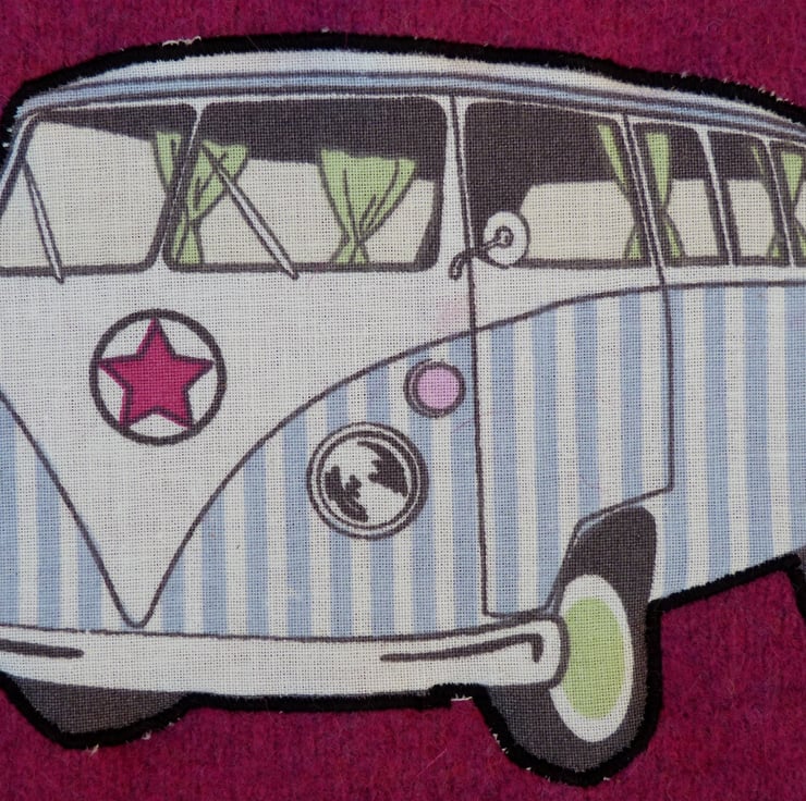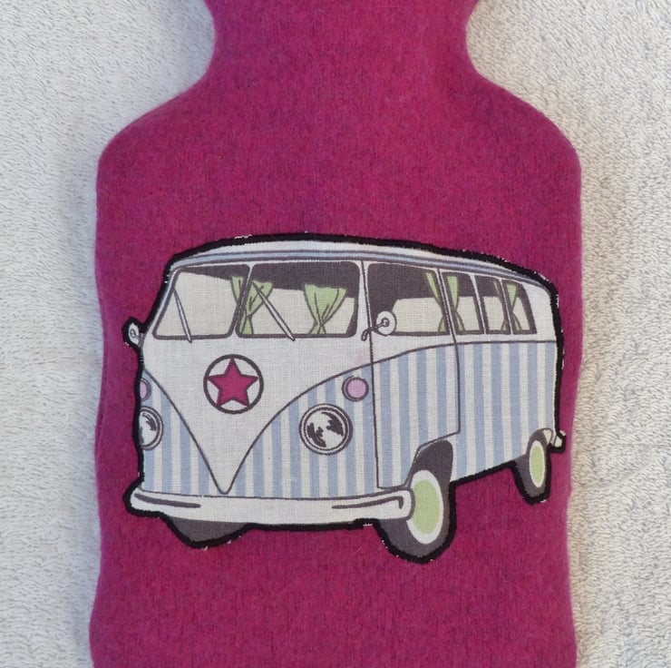 I have designed and created this fabulous VW camper hot water bottle cover from an up-cycled merino wool jumper. The van motif is attached with bondaweb, and then machine appliqued with a close zigzag stitch. The cover is an overlapping flap design, so your hot water bottle can be easily inserted.