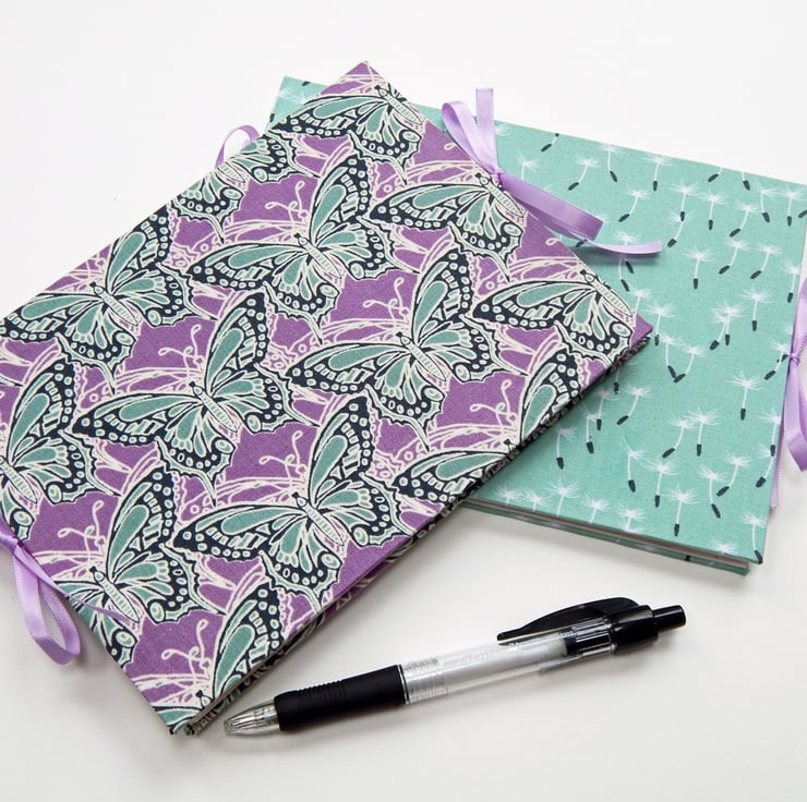 A photo album, with covers of Butterfly print fabric. The fabric is covered with a lovely butterfly pattern, in aqua, on a soft lilac background.