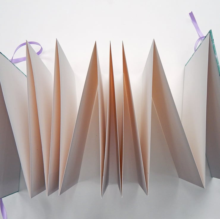The book has concertina-folded pages, with covers at either end of the concertina. It ties with lilac satin ribbon. The pages are made from a smooth white cartridge paper.