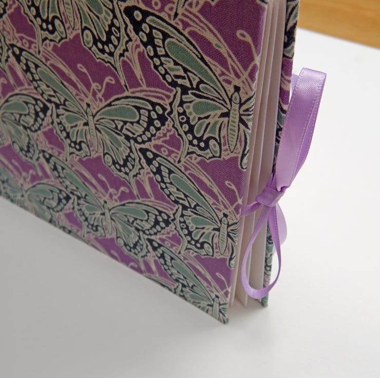 A photo album, with covers of Butterfly print fabric. The fabric is covered with a lovely butterfly pattern, in aqua, on a soft lilac background.
