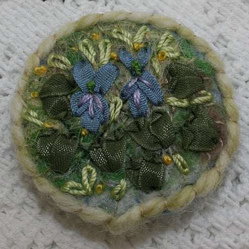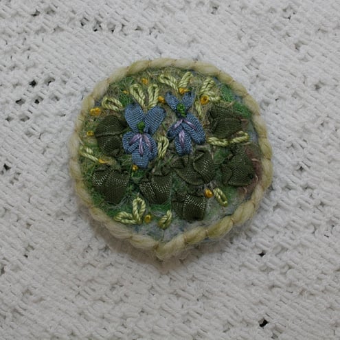 A small clump of wild dog violets nestle against the felted hedgerow background of this embroidered brooch.