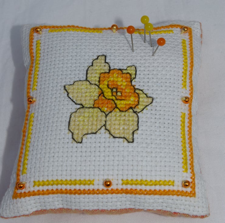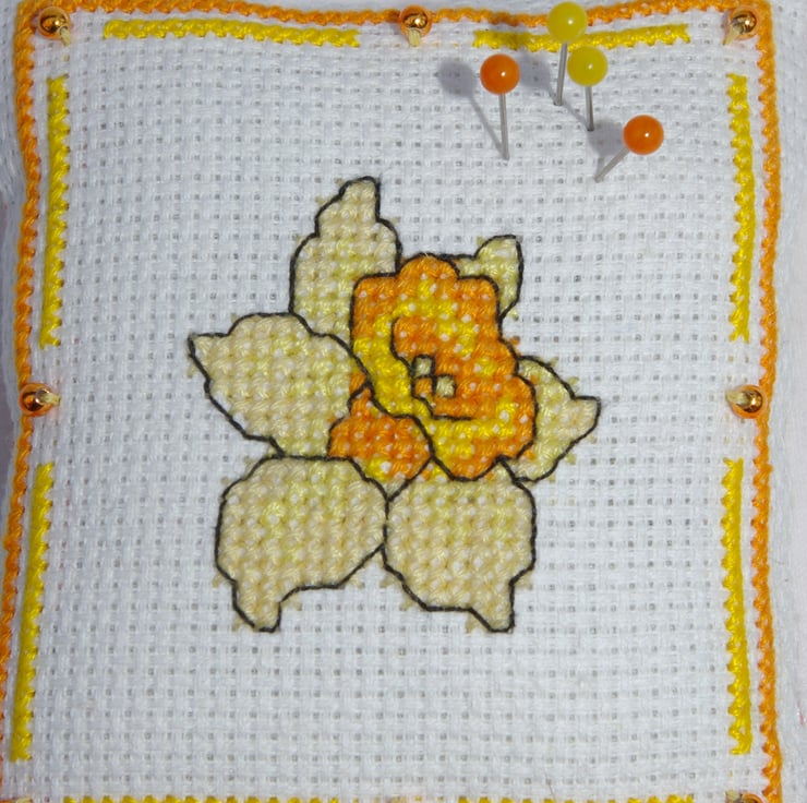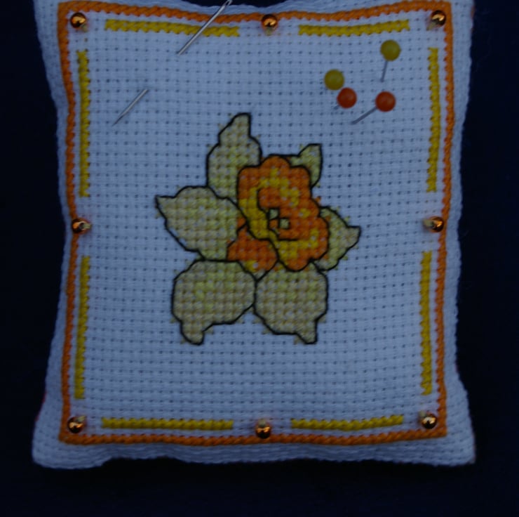 Daffodil Cross Stitch Pin Cushion in yellows and orange with beads. This little pin cushion has been handed sewn in cross stitch onto white cotton aida. The centre of the design is a cross stitch yellow and orange daffodil. This has a border of yellow cross stitch and orange shiny beads which is then surrounded in a finale row of orange cross stitching.