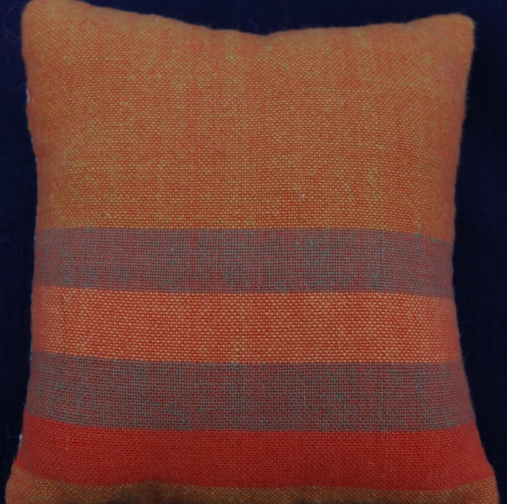 The reserve side of the pin cushion is made from a piece of striped orange and blue cotton fabric.