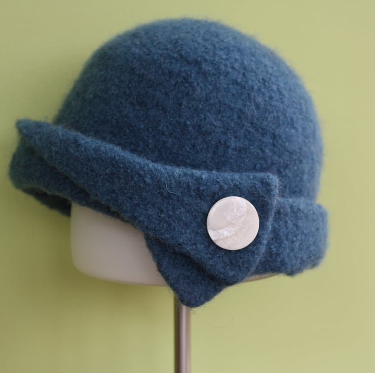It has been hand knitted and machine felted, and is decorated with a pearlescent button. It is a beautiful air-force blue.