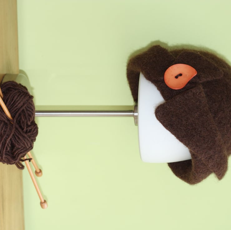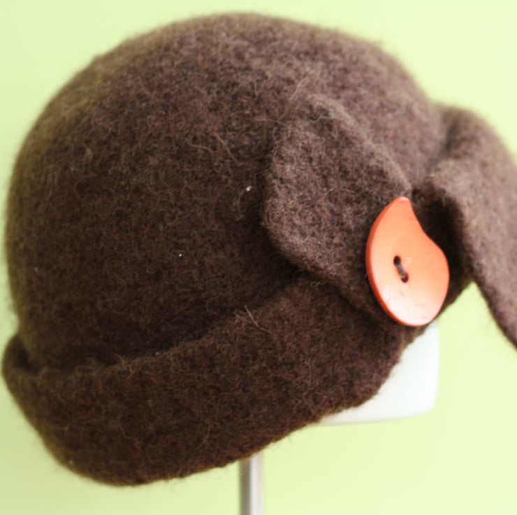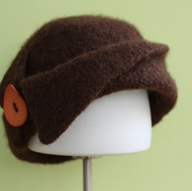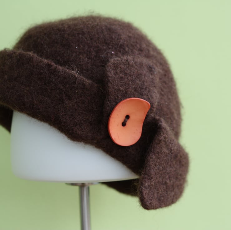 It has been hand knitted and machine felted. The hat is chocolate brown and is decorated with a burnt orange button.