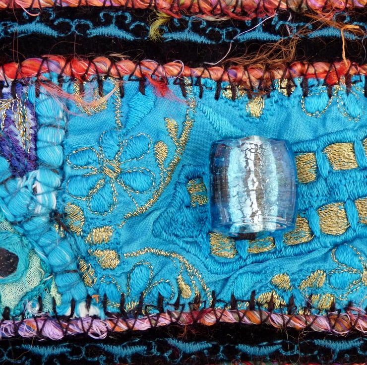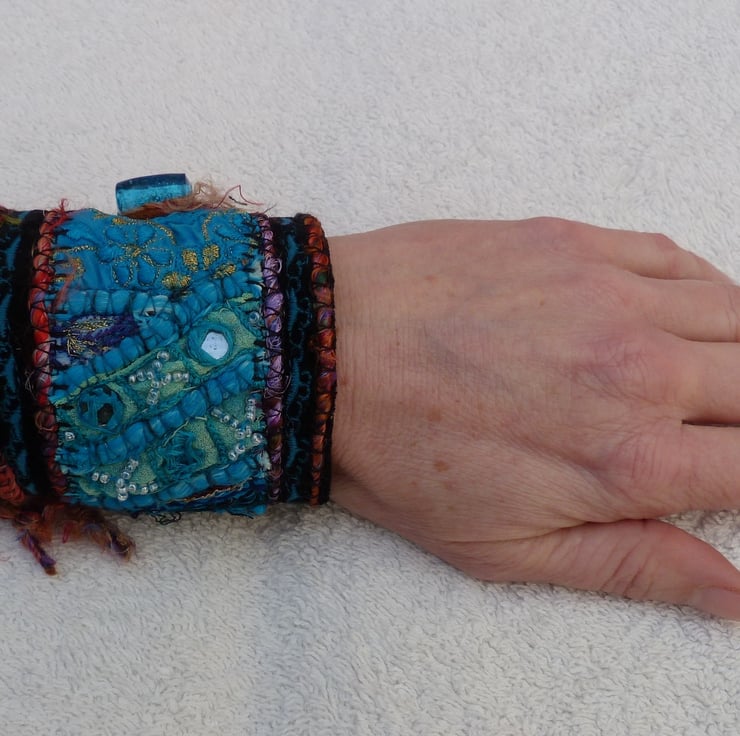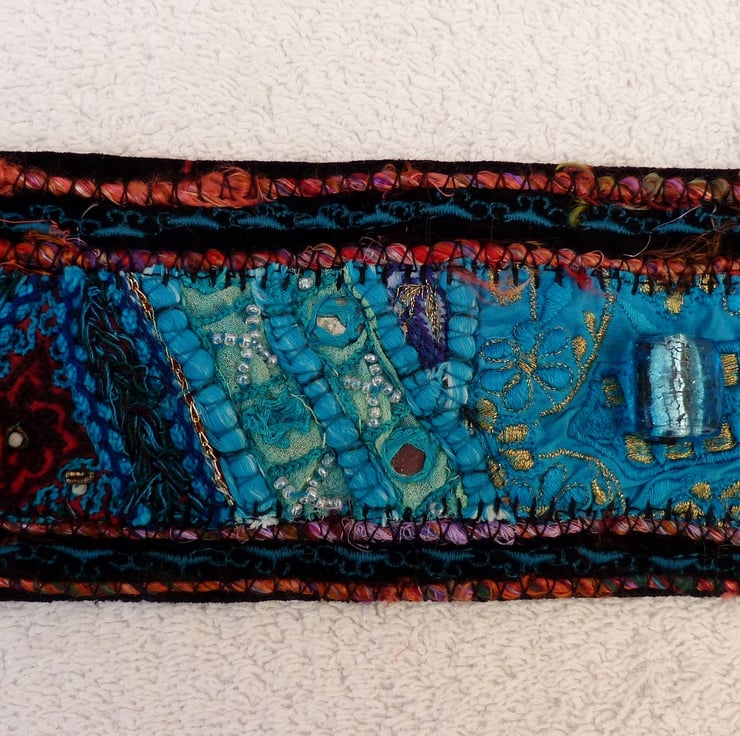 This wonderful fabric cuff has been created from black cotton velvet and recycled vintage Indian textiles. The cuff has been embellished with beads and sequins , and with up-cycled silk sari yarn couched threads. The cuff is lined with a plain black cotton fabric.