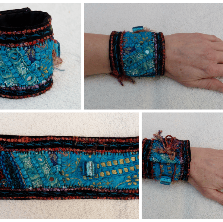 I was inspired to make these fabulous fabric cuffs from the left over pieces of vintage Indian textiles. It just seemed to be a great way to use these small pieces of fabric, and create a great piece of fabric art that you can wear!