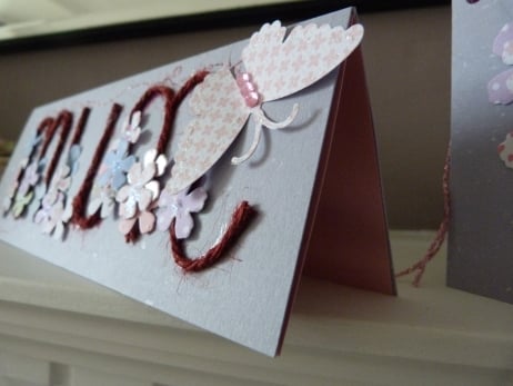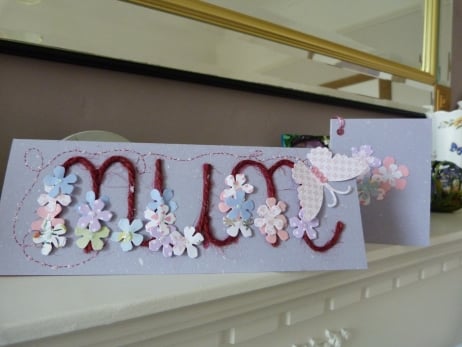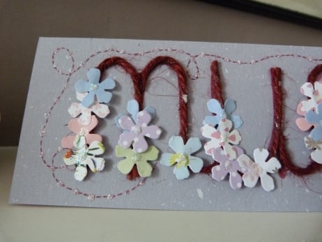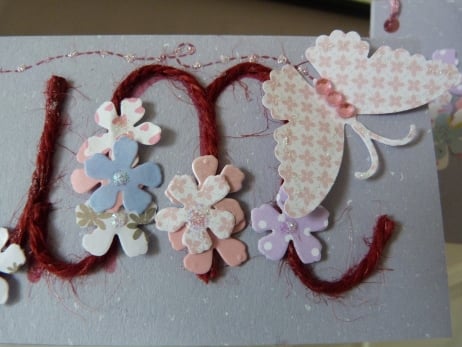A very unusual design which consists of the word Mum made from red twine which has been mounted onto quality grey flecked card. The word has been decorated with a multitude of flowers cut from pastel patterned paper. Finished off with a butterfly cut from pale pink flowery paper which leaves a red dotted line trail.. Finished off with pink rhinestones for the butterfly body and glitter centres to the flowers.