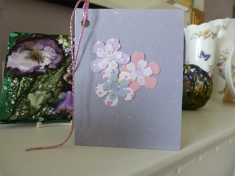 The tag has been made from grey fleck card with pale pink insert. Decorated with pretty pastel flowers with glitter centres and pink/silver cord.