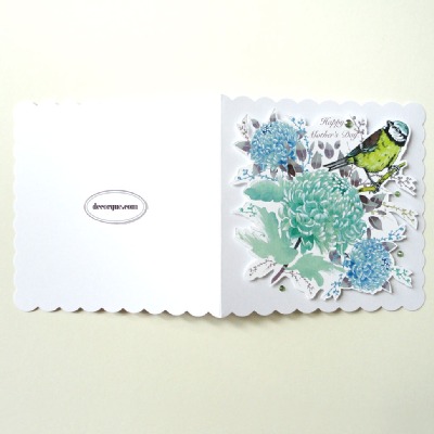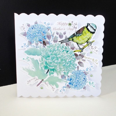 A beautiful water-colour design is all hand painted. The softly coloured Chrysanthemum flowers heads are a contrast to detailed painting of one of our favourite English garden birds the blue-tit. Small branches and the text saying 'Happy Mother's Day' is added in Photoshop.