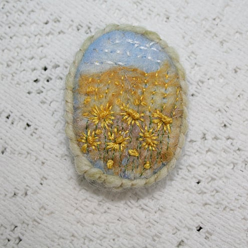 This beautiful daisy-shaped flower was once common in barley crops. In this brooch, it provides a lovely golden glow against the felted cornfield background.