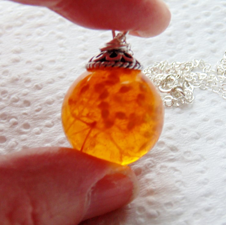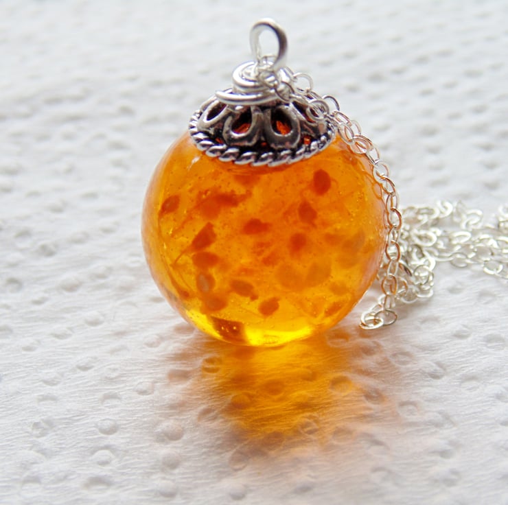 Description: I added these pretty little flowers to UV resistant, non toxic eco friendly amber colour resin, This orb measures approx 20mm I have capped with a pretty ornate silver cab and hung on a pretty 18" 925 sterling silver chain. Love the way the flowers are captured within the resin, my inspiration being a love of amber jewellery