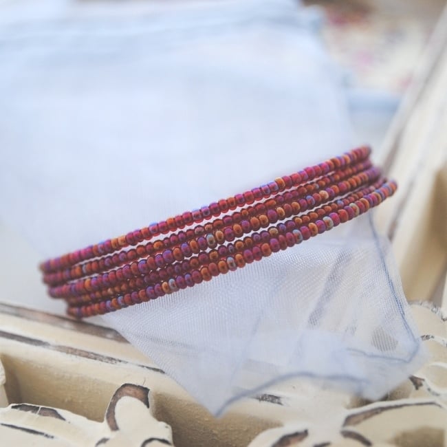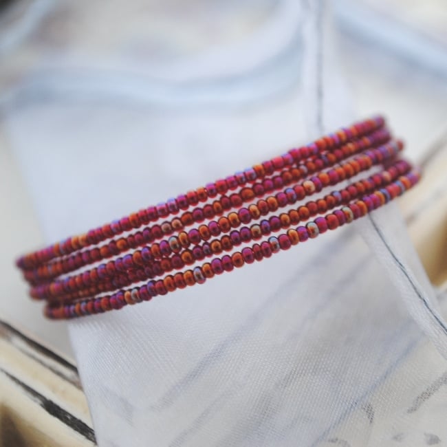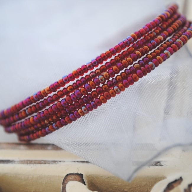 Wrap bracelet with lustre red seed beads . The bracelet is made using 5 loops of silver plated memory wire and will fit any size wrist. The seed beads vary in tone and have elements of gold and red / orange.