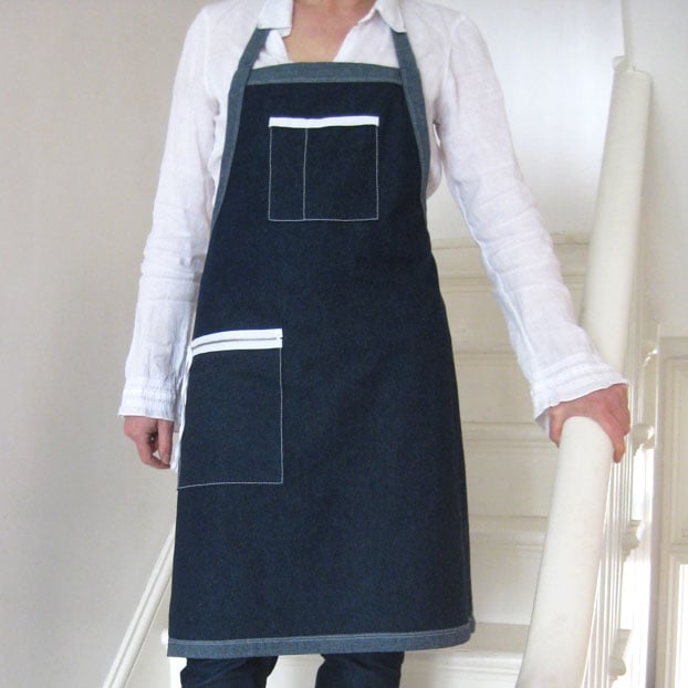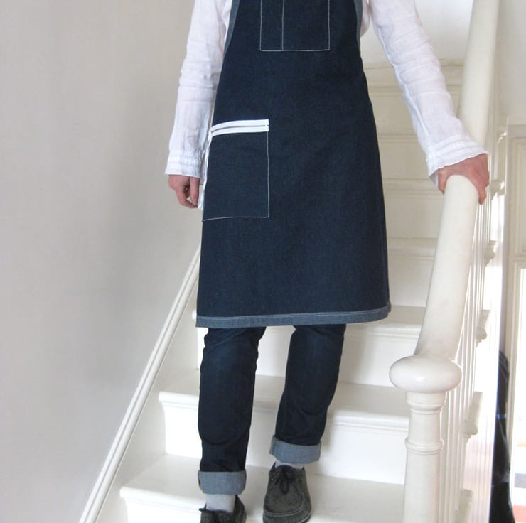 LAST ONE OF ARCHIVE DESIGN! Dark denim tie apron designed for artists and makers, home and garden. Medium-heavy weight cotton denim with contrasting reverse denim edging and ties. The zip pocket provides a secure place for small tools or phone, whilst keeping out craft waste like wood shavings or glass pieces. Beautifully sewn, meticulously designed and made-to-last. Ideal gift for makers, painters, designers and artists.