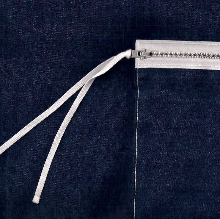 KEY FEATURES: Tie apron - Zip pocket with white tape pull strings - Chest pocket with two compartments and white cotton bound edge - White stitching - Reverse denim edges