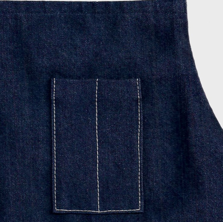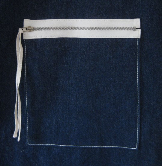 KEY FEATURES: Medium weight denim - Zip pocket with white brass teeth zip and cotton pull strings - Bib pocket with 2 compartments - Gift wrapped