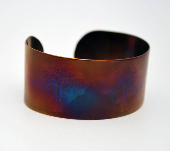 This steel multi-coloured cuff has the image of repeated trees etched onto the surgical steel surface, polished to create definition and contrast. It has been heat coloured using a jeweller's torch and treated during the cooling process to fix the patina, which is very durable and if the accompanying colour care proceedures are observed, will not fade. The colours are very deep and vibrant, and range from orange, purple, dark blue, light blue, and in some cases, lemon yellow, peach and green. I use environmentally friendly etching processes when producing my designs, and each piece is subtly unique. This will not tarnish as it is polished stainless steel.