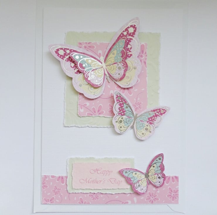 This pretty Mother's Day card has been made in a range of soft pinks, greens and lemons. The butterfly card toppers used have a silver foil detail. The wording on the front of this card reads 'Happy Mother's Day'.