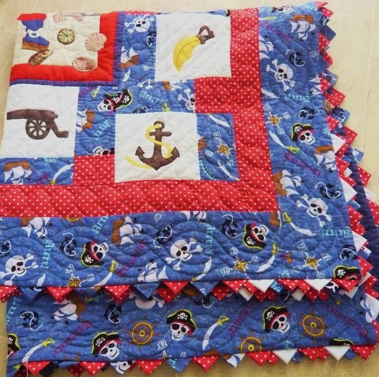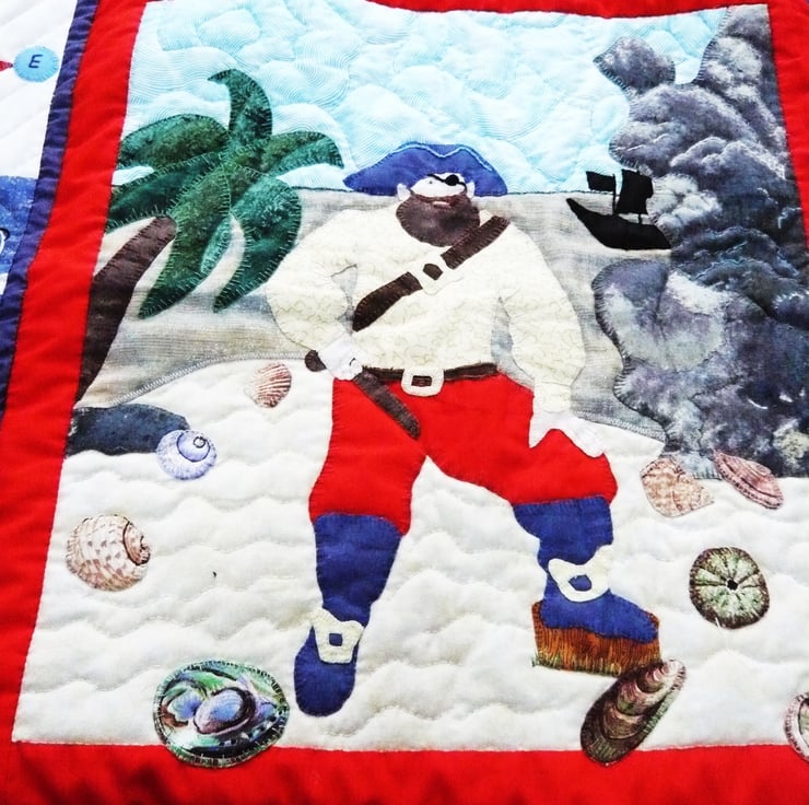 This is a large child's quilt with a gorgeous Pirate theme, it has a big picture of a pirate on a beach with a palm tree and a few shells .all of which I have hand appliqued. Around the main pirate picture are squares of off white fabric with hand appliqued shapes with a pirate theme. The border of the squares is mid blue pirate fabric with red and white spotty fabric in between. I have hand quilted all over the quilt, the final border is hand quilted with waves and the final trim I have made a shark tooth edge.