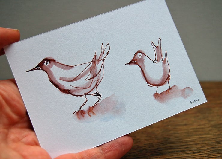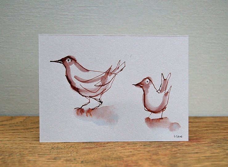 This is an original pen and ink sketch of two blackbirds (brownbirds). I've applied a light wash to the drawing, using the same brown ink, along with a dot of very pale blue watercolour in the shadow.