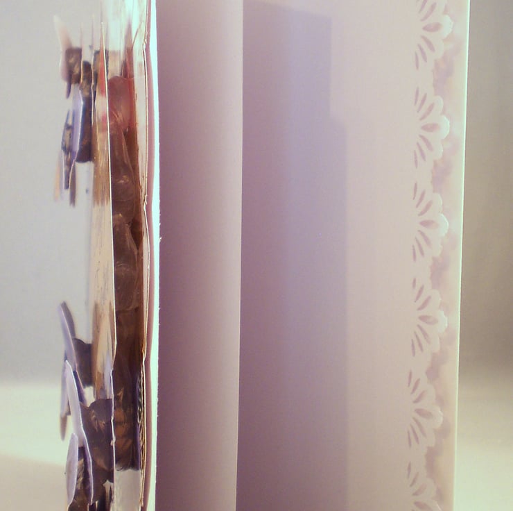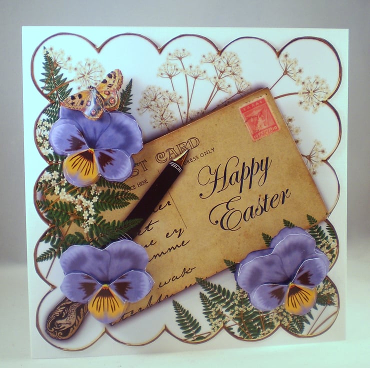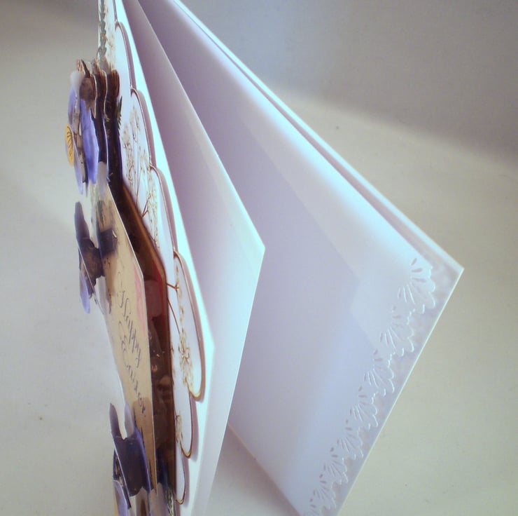 A white square card measuring 145x145mm ( 5.5x5.5in) features pretty violas/pansies. Insert is white with a decorative punched border. I have left the inside blank but please let me know if you would like otherwise