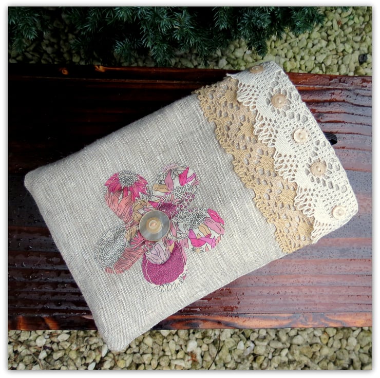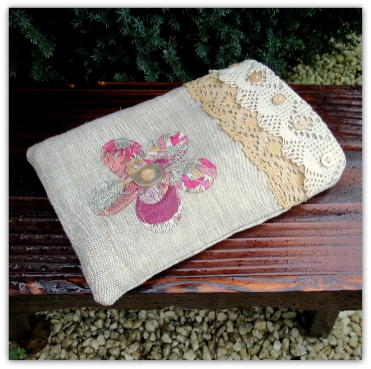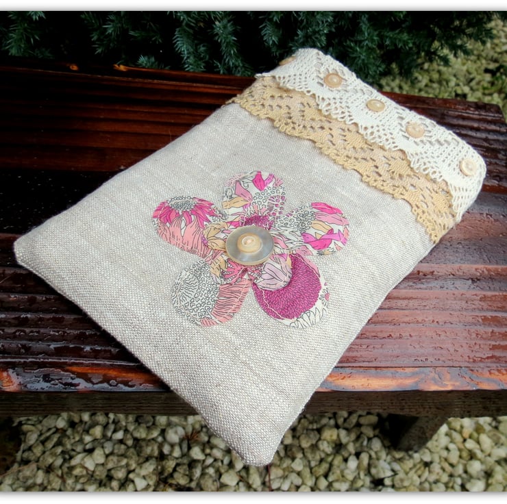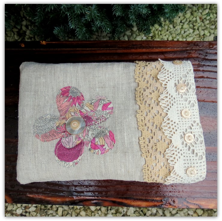 The linen background contrasts beautifully with the vintage lace and Liberty Lawn flower.