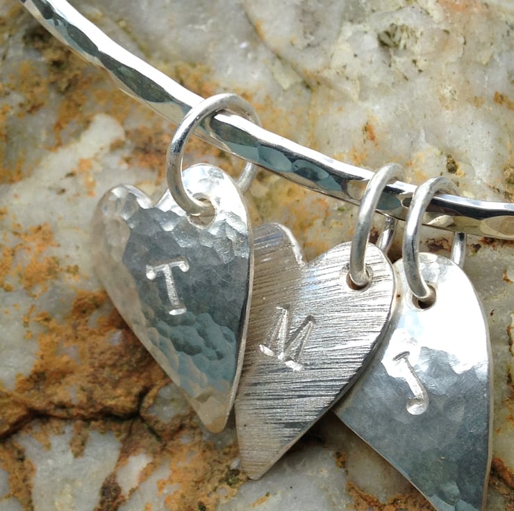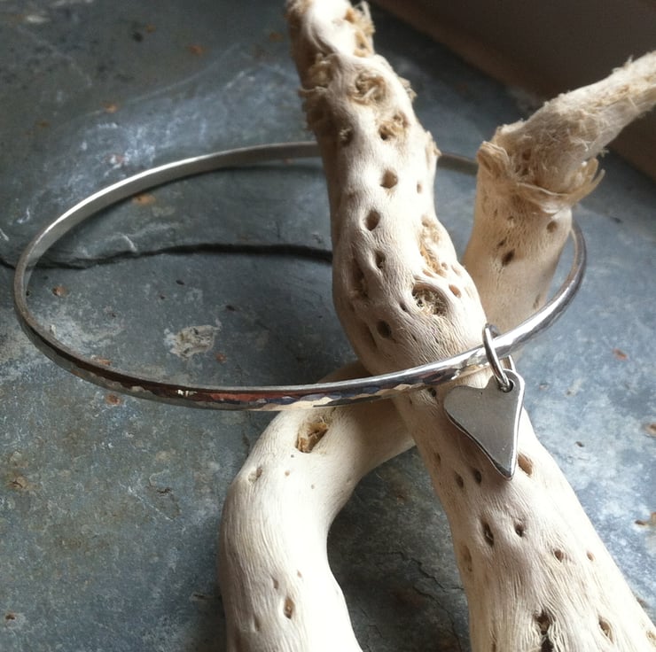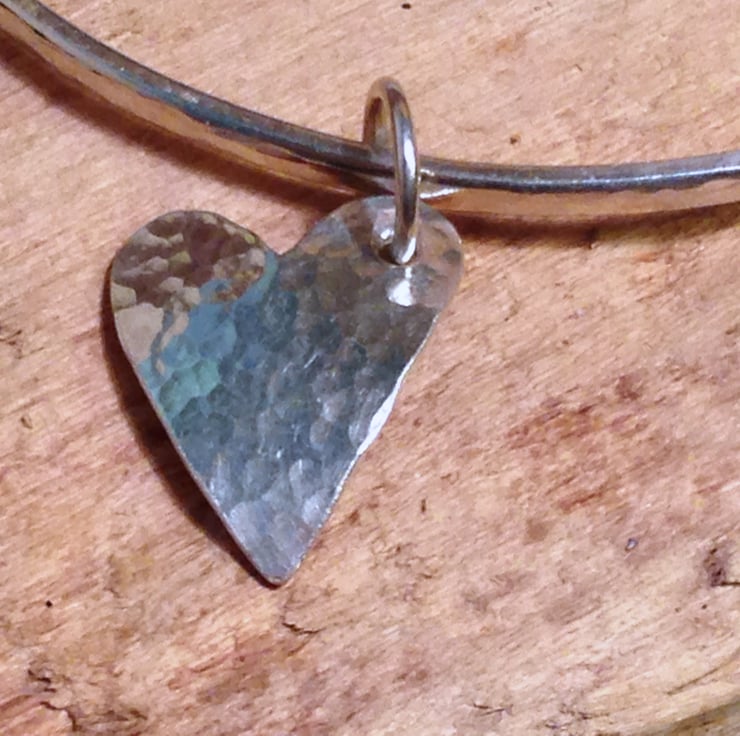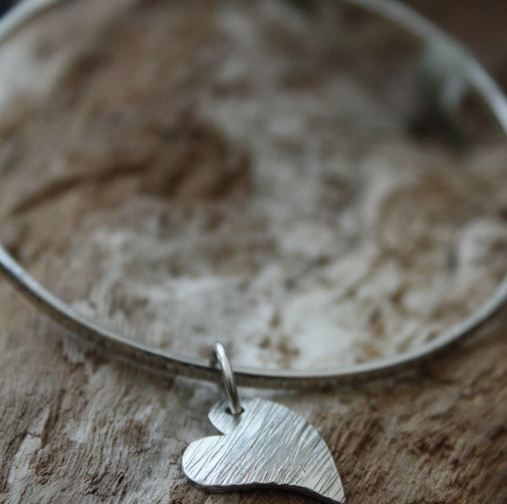 A lovely textured bangle hand forged from 2.3 x 1.5mm D section sterling silver wire, with a delicate heart charm attached. Plain, hammered or striated finish - please specify when ordering.