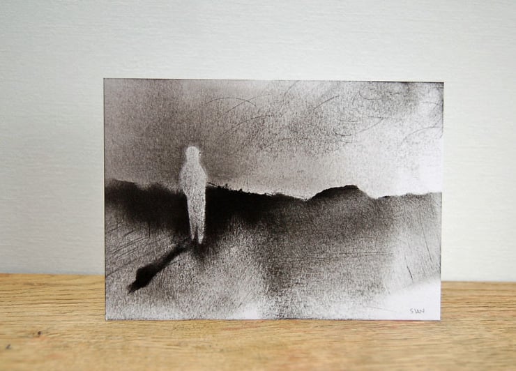 This is one a series of original paintings depicting a solitary walker casting their shadow on a moorland landscape. It is created by applying black pigment ink onto drawing paper using sponges and stencils.