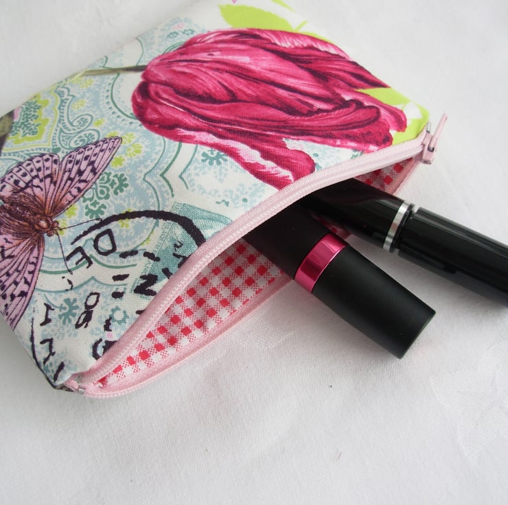 I've made this little make up bag from cotton fabric - in a French Chic style which has flowers, foliage and birds in pinks, greens, white, aqua, brown. - it it fully lined with a deep pink and white checkedcotton fabric and has interfacing to give stability. It has a top zip.