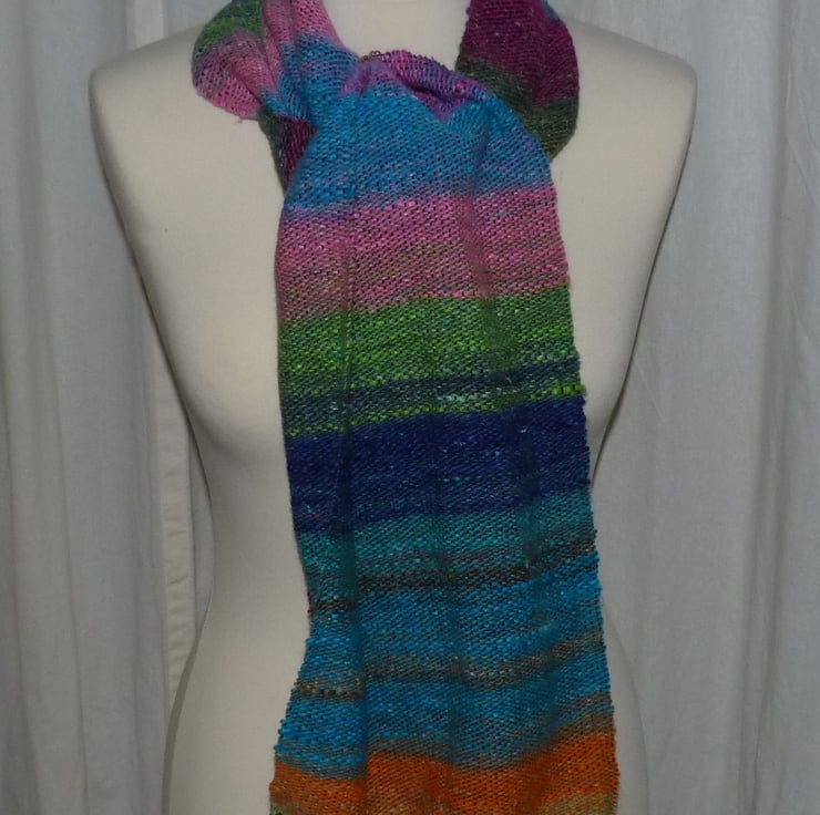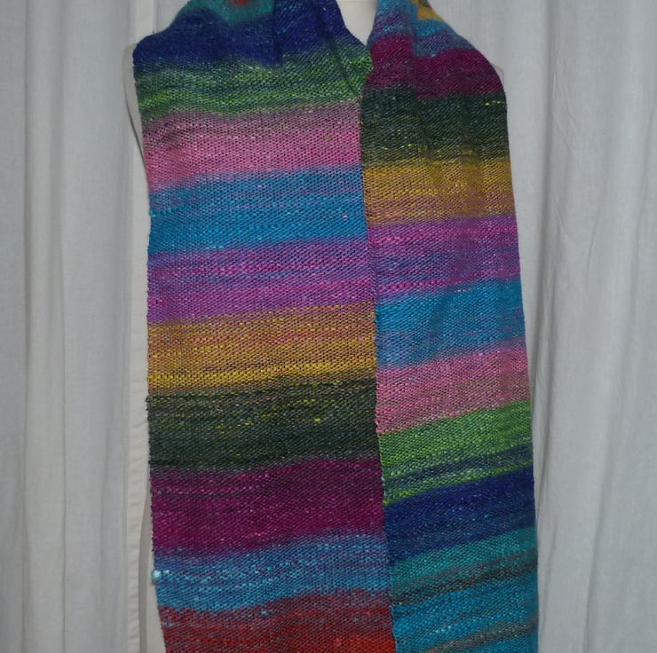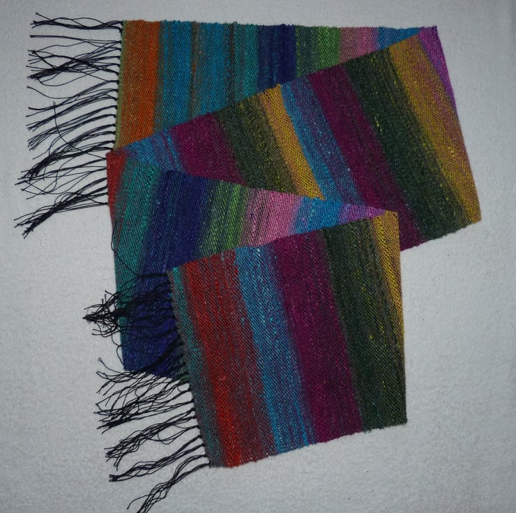 I have hand woven this lovely scarf on my rigid heddle loom. I have used 2 yarns. The warp is 4 ply 100% mercerised cotton in black. The weft is Noro Silk Garden sock yarn, a blend of 40% wool, 25% silk, 25% nylon and 10% mohair .It makes a beautifully weighted scarf which is really soft and cosy.