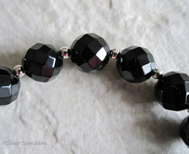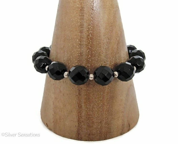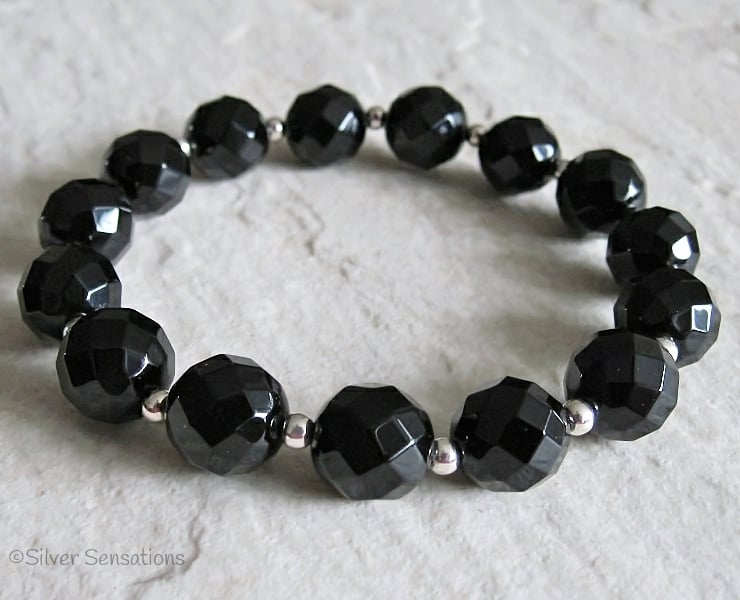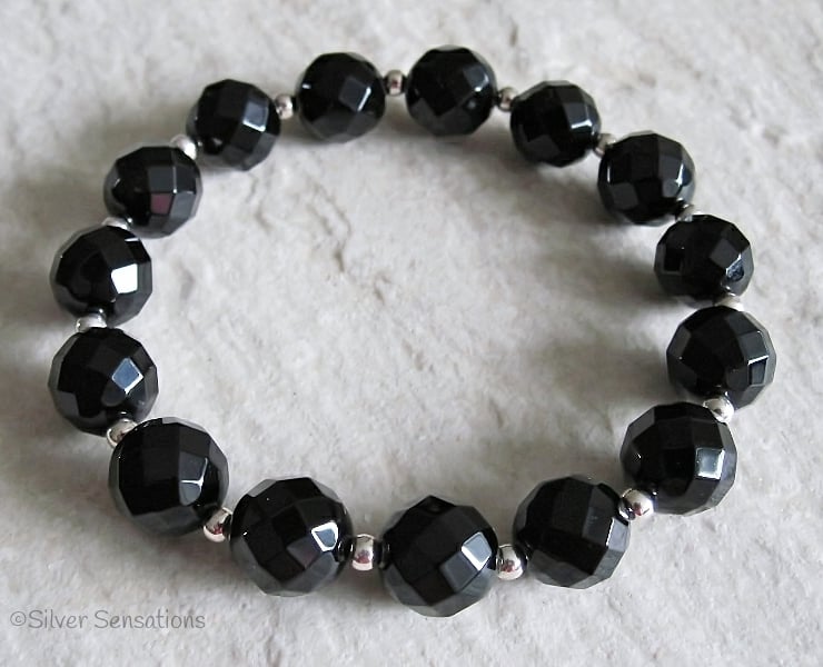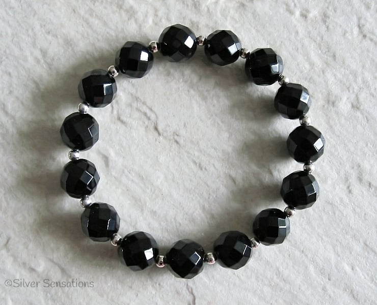 This handmade stretchy fashion bracelet has been created with beautiful faceted Black Onyx round beads which are 10mm in size.