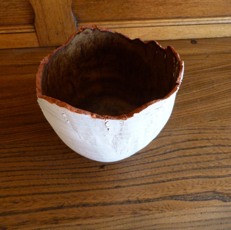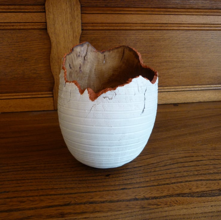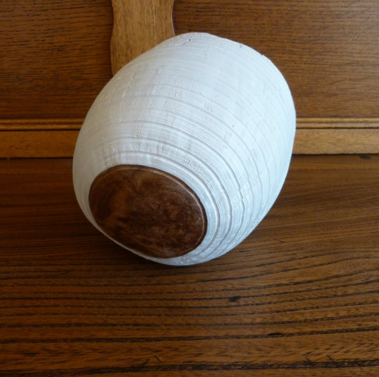 THIS IS A ROCKING BOWL, IT HAS NO FOOT. IT WAS TURNED GREEN, AS THE WOOD DRYED IT CHANGED SHAPE A LITTLE. MADE OF BURR OAK, THE OUTSIDE FACE IS TEXTURED AND PAINTED WHITE. AT 7'' TALL AND 5'' WIDE THIS PIECE CAN HAVE MANY USES IN THE HOME.