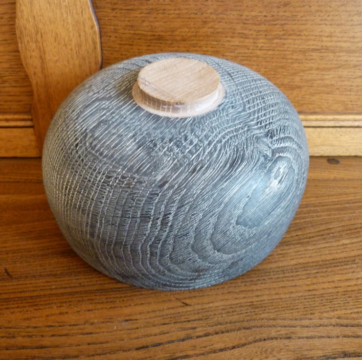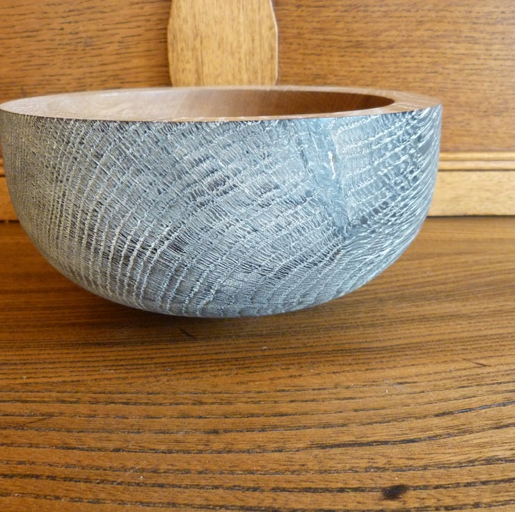 THE OUTSIDE FACE WAS FIRST SCORCHED WITH A BLOW-LAMP,THE CARBON THEN BRUSHED FROM THE NOW RAISED GRAIN.DANISH OIL IS THEN APPLIED AND WHEN DRYE , LIMING WAX TO FINISH