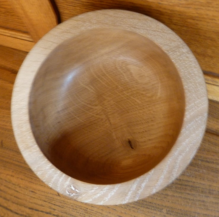 NICE HEAVY, THICK WALLED OAK BOWL. 7.5'' IN DIAMETER-3.5'' HIGH.