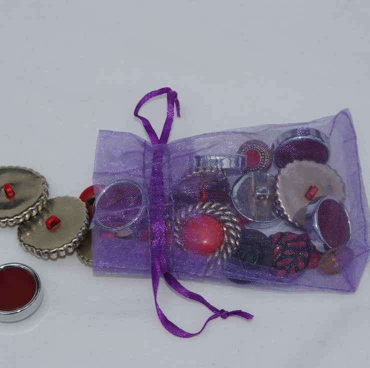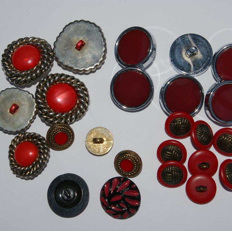 A collection of twenty-four mixed red vintage buttons. All the buttons are of the Shank variety. They range in colour combinations of red with gold, red with silver, red with black and red with bronze. Most of the buttons are made with plastic and some have metal parts to them.