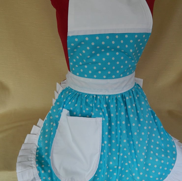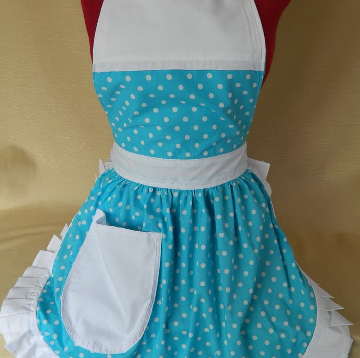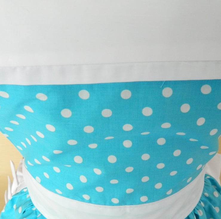 Here we have a lovely cotton rich turquoise and white polka dot with white trim retro style apron, handmade in house to our own design. (see photos). Adjustable neck and waist ties so will fit up to a size 22.