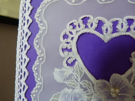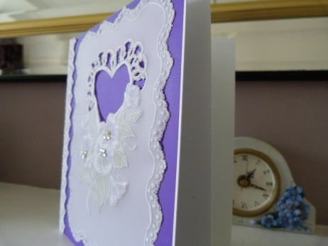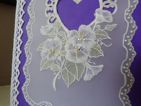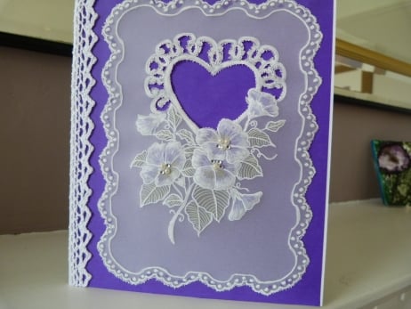A beautiful design of heart with a posy of pansies embossed, cut and pierced from parchment. The flowers and leaves coloured in lilac, lemon and pale green. The centre of the flowers decorated with pearls and crystal rhinestones. The edge of the parchment finished off with a pretty scalloped edging. The parchment has been mounted onto purple vellum and then onto quality white card. Finished off with white vintage style cotton lace.;