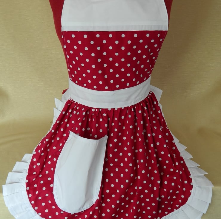 Here we have a lovely cotton rich deep red and white polka dot with white trim retro style apron, handmade in house to our own design. (see photos). Adjustable neck and waist ties so will fit up to a size 22.