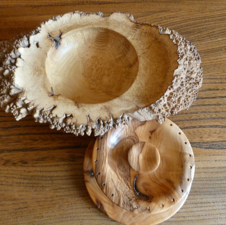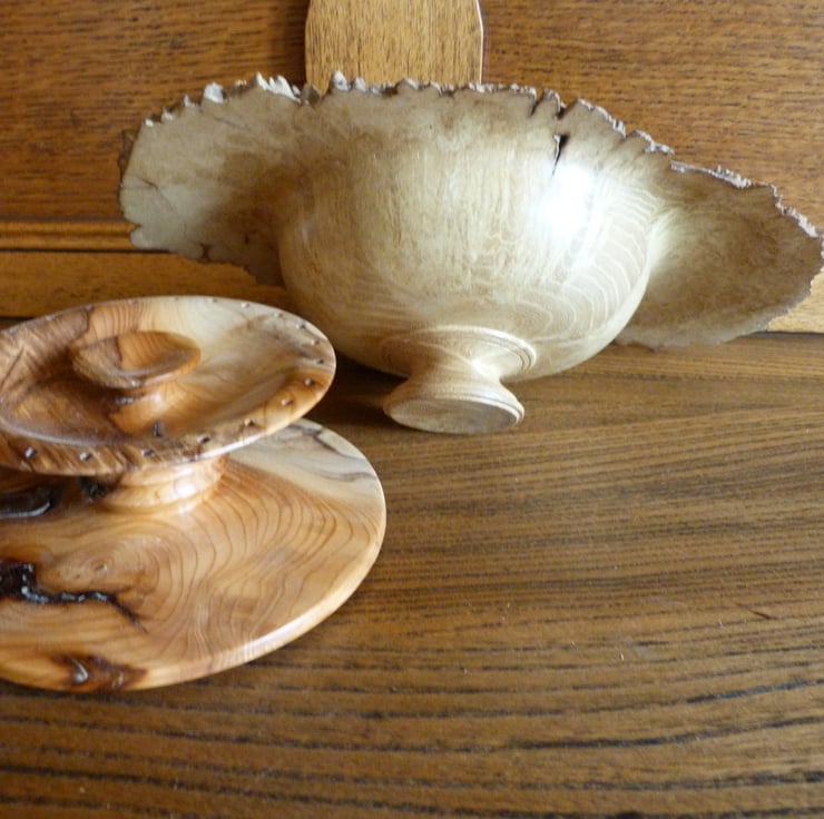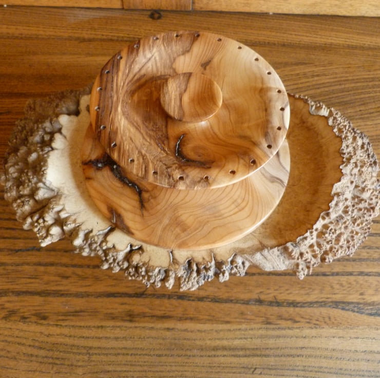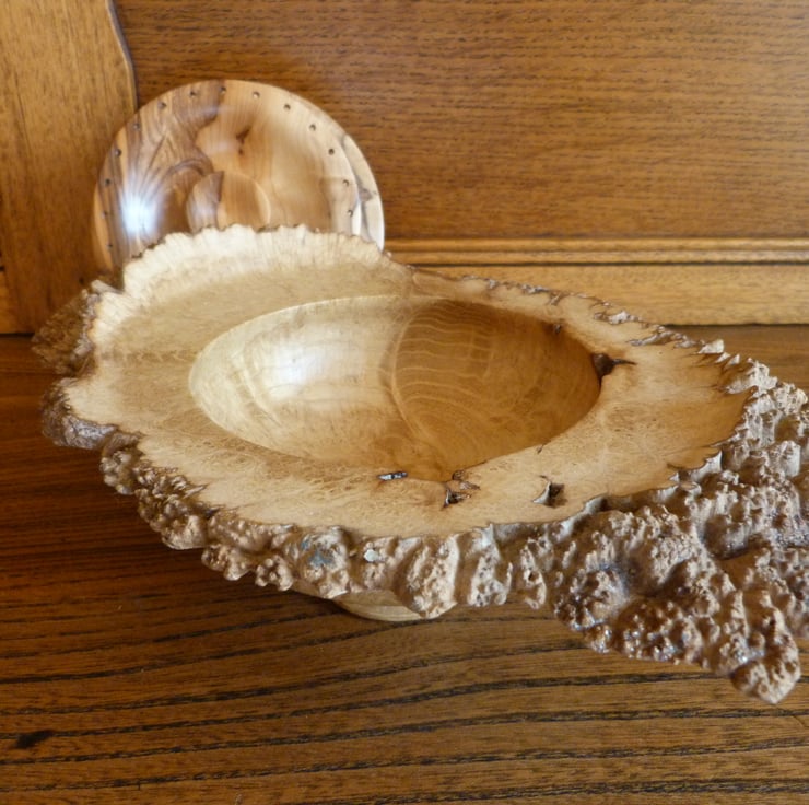 THE TOP PART OF THIS PIECE IS THE EARING STAND,THIS IS MADE YEW. THE BOTTOM PART IS A CONTAINER MADE OF ACCACIA , BURR, THIS FOR RINGS-NECKLACES ETC. 5'' HIGH AND 9.5''TO THE LONGEST PART. FINISHED WITH DANISH OIL AND WOOD WAX TO POLISH.