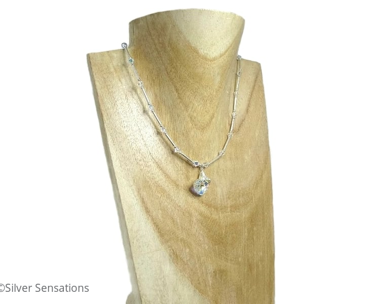 A beautiful hand made designer Bridal or occasion necklace which has Sterling Silver straight tubes with stations of rainbow Swarovski Crystals.