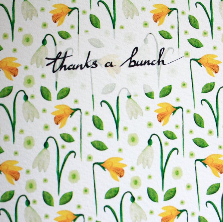 Pretty patterned card featuring my original watercolour, springtime British wild flowers pattern and calligraphy 'thanks a bunch'