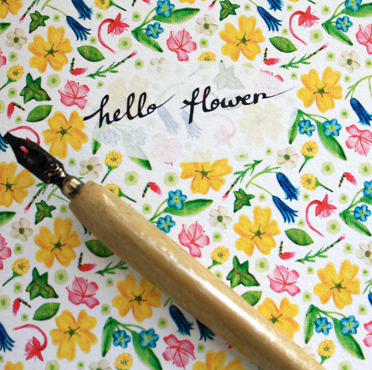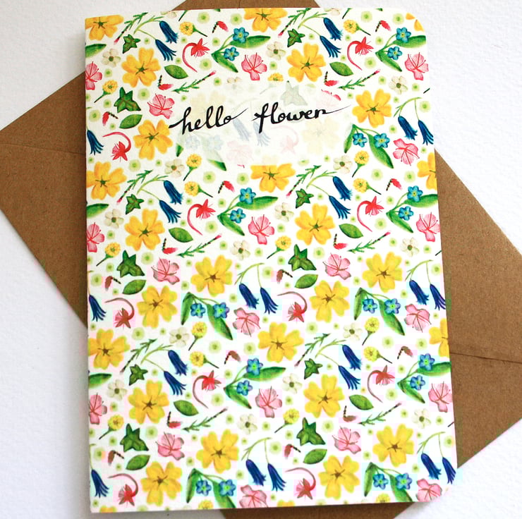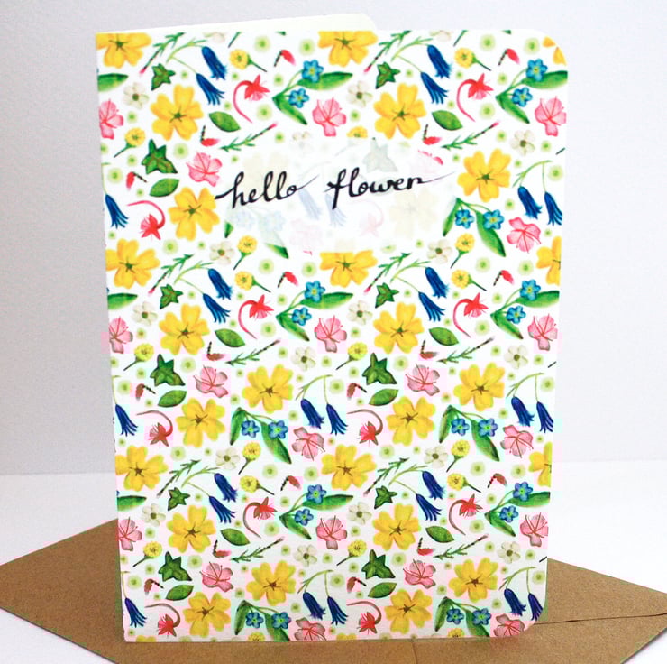 Pretty patterned card featuring my original watercolour British wild flowers pattern and calligraphy 'hello flower'