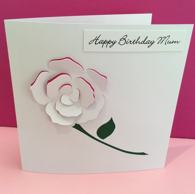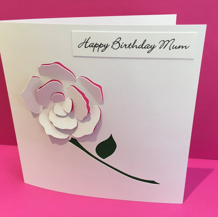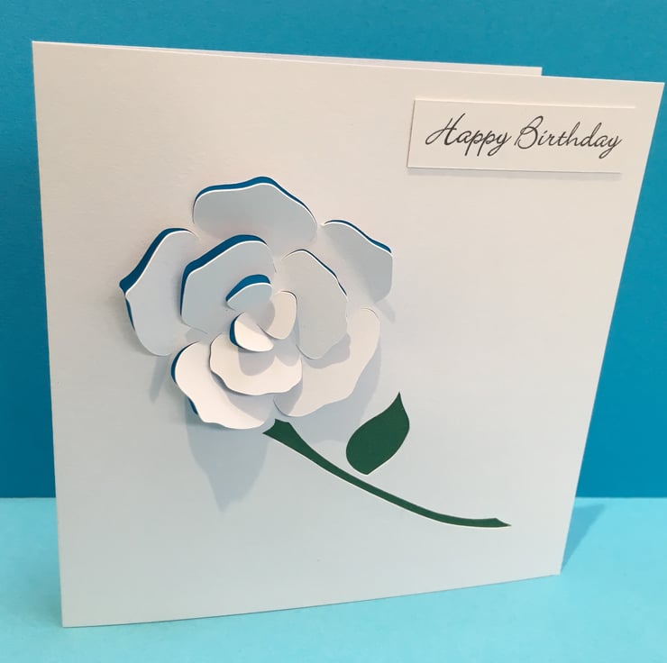 This beautiful birthday card has been made by paper cutting rose petals and delicately folding them out of the card. Simple and stunning for someone special on their special day with a birthday message added for that personal touch.