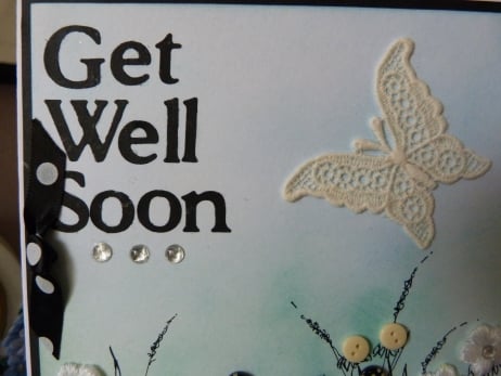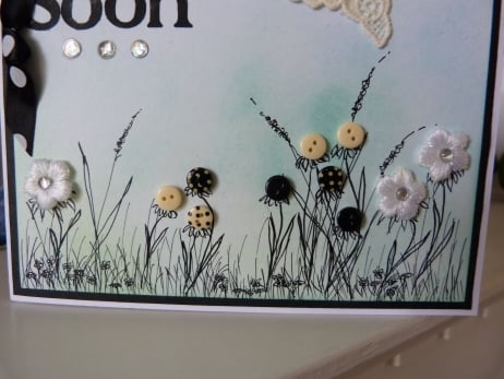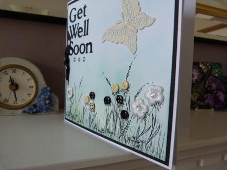 A unique completely handmade card of pretty grasses drawn in pen and ink. Button flowers and crochet flowers with rhinestone centres. The background coloured with pale blue melding into pale green, onto white card. This has been mounted onto black paper then onto quality white card. Decorated with a fabric butterfly and Get Well Soon cut from black paper. Finished off with a row of 3 rhinestones and a black with white spots ribbon bow.