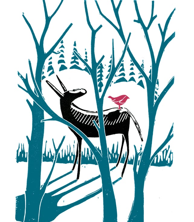 A4 (21cm x 29.7cm) poster-print entitled 'Donkey And Bird' printed in teal, black and red.