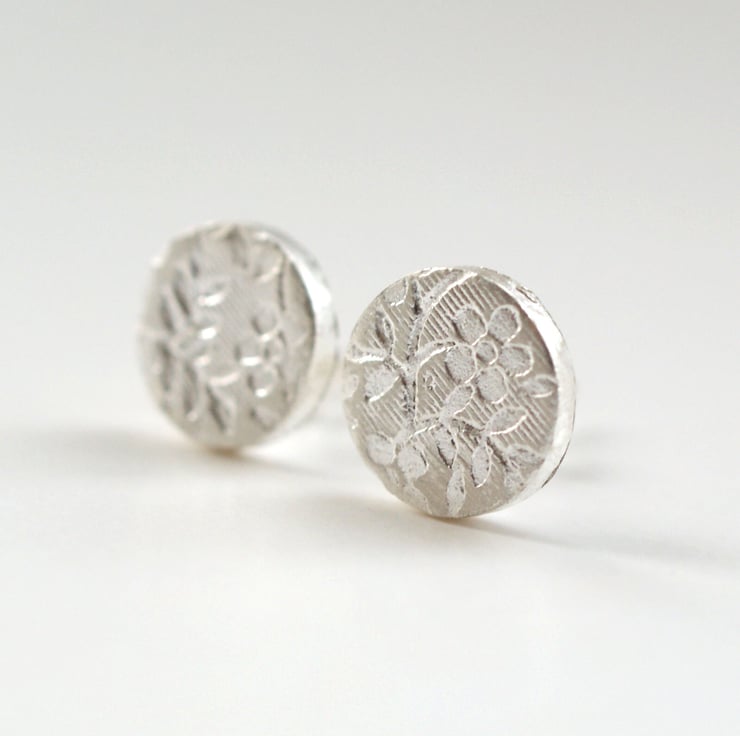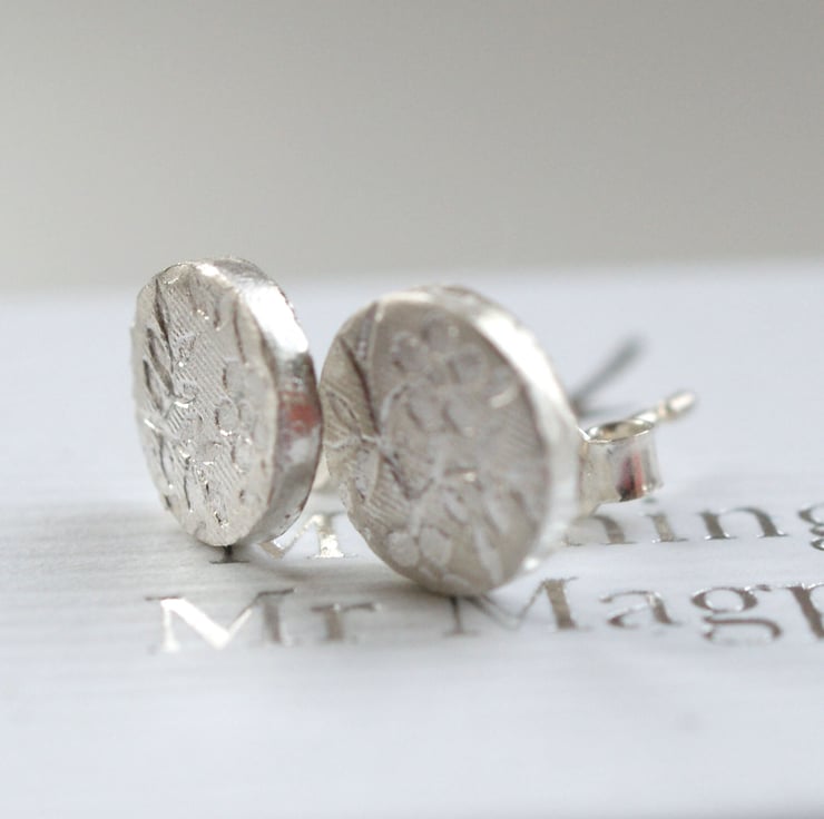These fine silver circular studs are 9mm diameter with our Secret Garden floral pattern pressed into them.