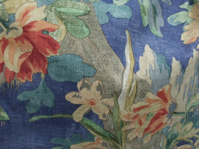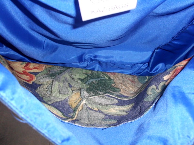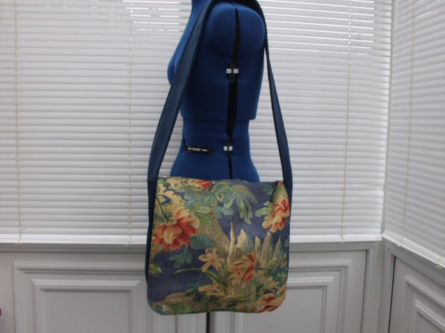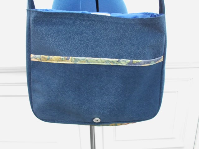 This bag is made from a fabric that feels like suede in a dark blue I have used this on the back ,sides , front and strap . The front flap is made from 100% cotton with a floral print which is padded and top stiched ,. The front of the bag under the flap has a large pocket in the same blue suede fabric which I have edged the top of the pocket in the floral fabric to match the flap . The linning is a royal blue satin with a large pocket made from the floral fabric that has also been lined with the blue satin .
