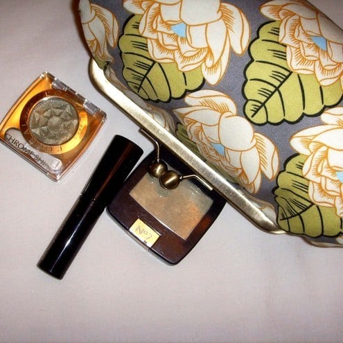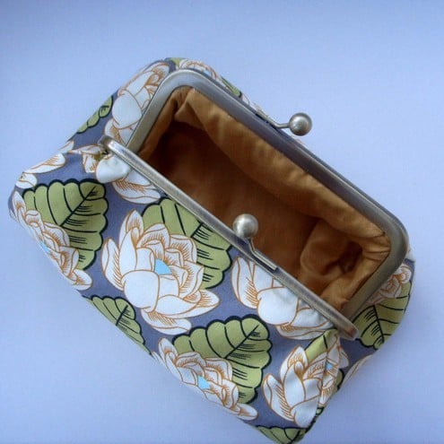 Perfect little clutch for your mobile phone, keys, sunglasses,change and credit cards or even a make-up bag. Pretty Amy Butler lotus Flower fabric with contrasting lining, padding and metal frame clasp.