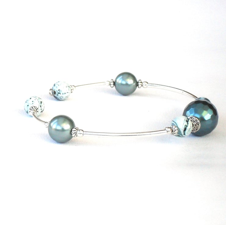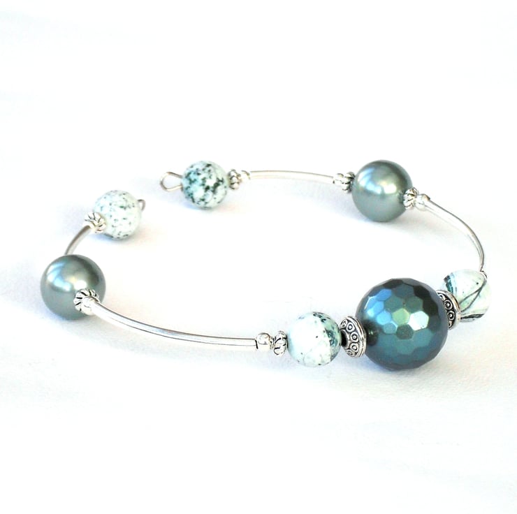 A stunning bangle style of bracelet, made with green semi-precious agate and shell pearls.