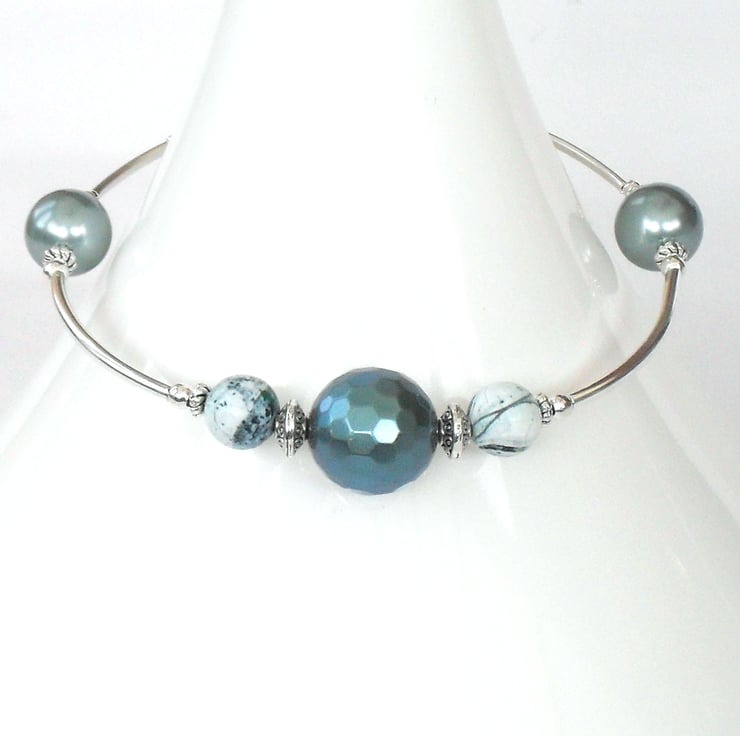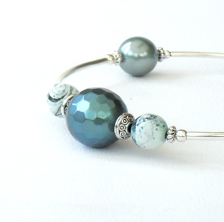 Tibetan silver spacer beads add to the detail and accentuate the gemstones. Silver coloured curved spacer tubes add strength to the bracelet / bangle.
